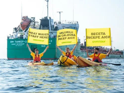 Activiști Greenpeace România în caiace protestează în fața petrolierului rusesc VF Tanker 2. Activiștii cer Guvernului României să nu mai amâne tranziția către energie curată, care nu distruge mediul și nu alimentează războaie.