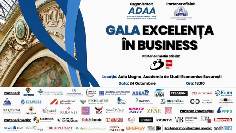 Gala Excelența în Business, organizată de Asociația pentru Dezvoltarea Antreprenoriatului Autohton ADAA, având ca partener oficial Academia de Studii Economice București, va avea loc pe data de 24 octombrie, începând cu ora 18.00 în Aula Magna ASE și reprezintă o oportunitate de a recunoaște și de a sărbători realizările și contribuțiile semnificative aduse de liderii și companiile din economie.