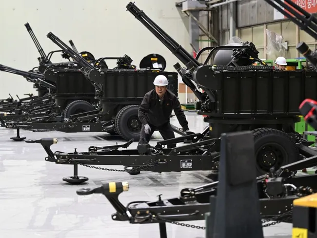 Un inginer sud-coreean lucrează la un tun antiaerian pe roți de 30 mm K-30W Chunho, la fabrica Hanwha Aerospace, din Changwon - Foto: Profimedia Images