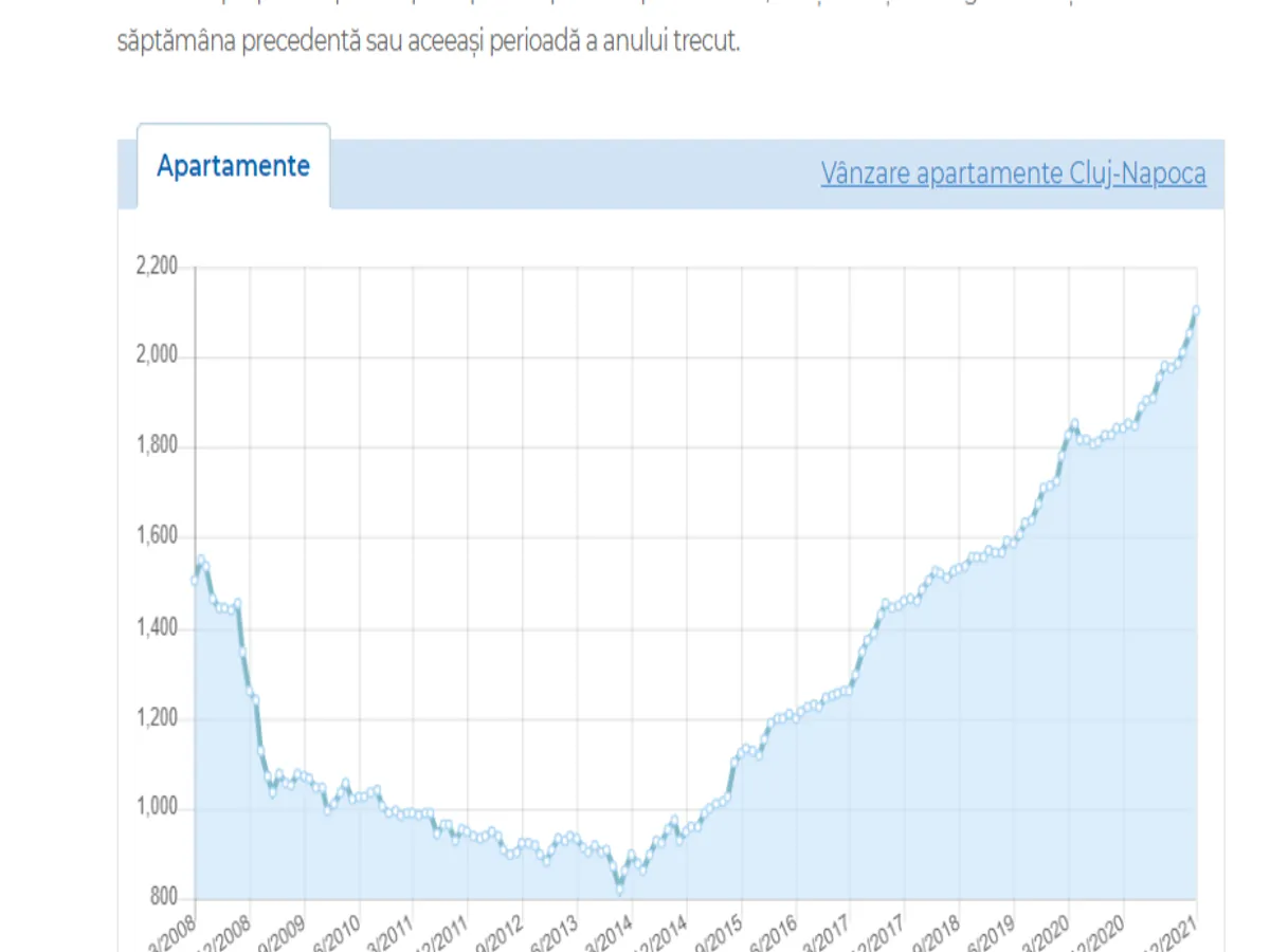 La Cluj, piața imobiliară a scăzut constant în următorii ani ajungând la un minim de 862 de euro metru pătrat în anul 2014.
