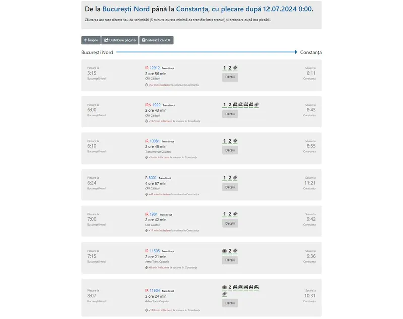 Cu greu, ceva informații pot fi găsite pe site-ul mersultrenurilor.infofer.ro. De aici am aflat că, până la orele prânzului, recordul de întârziere al zilei pe ruta București Nord - Constanța a fost stabilit de trenul CFR „IRN 1922”, care a plecat din capitală la 6.00, pe „răcoare”, și trebuia să ajungă în gata de pe Litoral la ora 8.43.