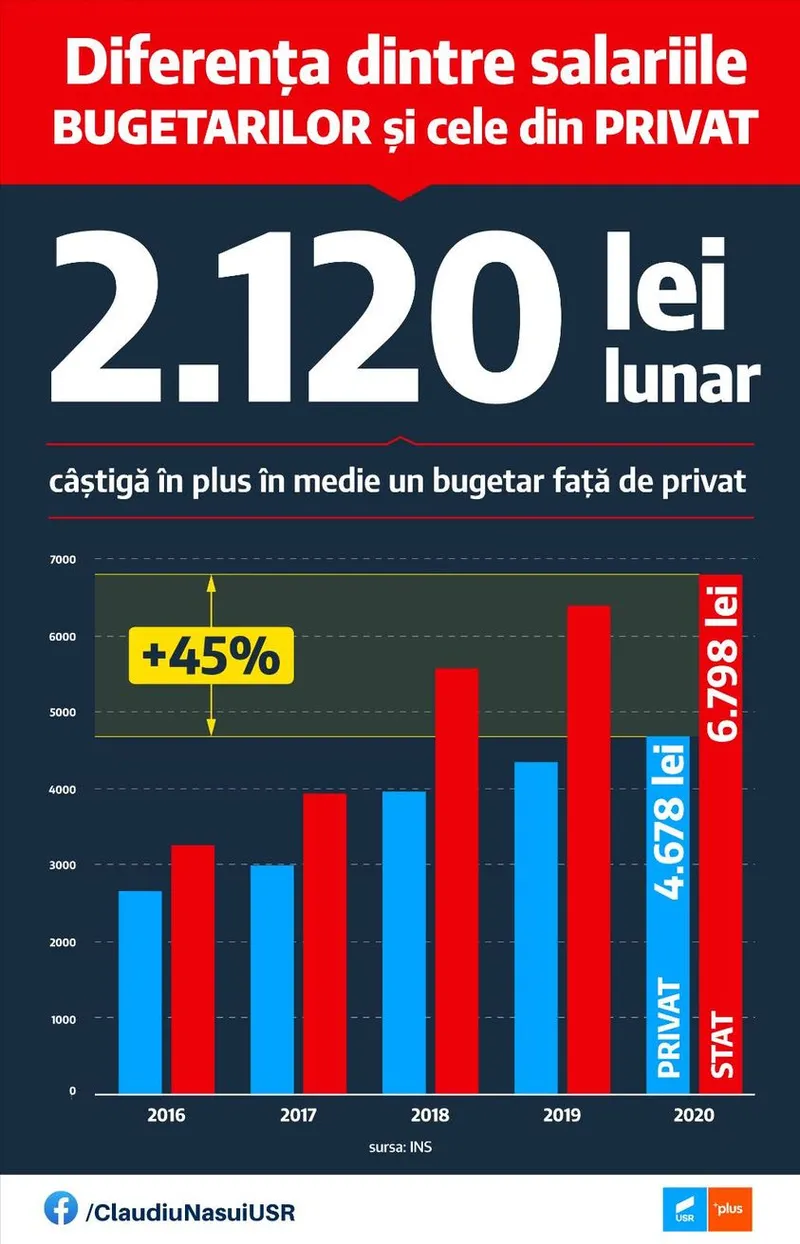 Deputatul USR Claudiu Năsui a arătat, pe Facebook, că media salariilor din sectorul bugetar este cu 45% față de media salariilor din sectorul privat.