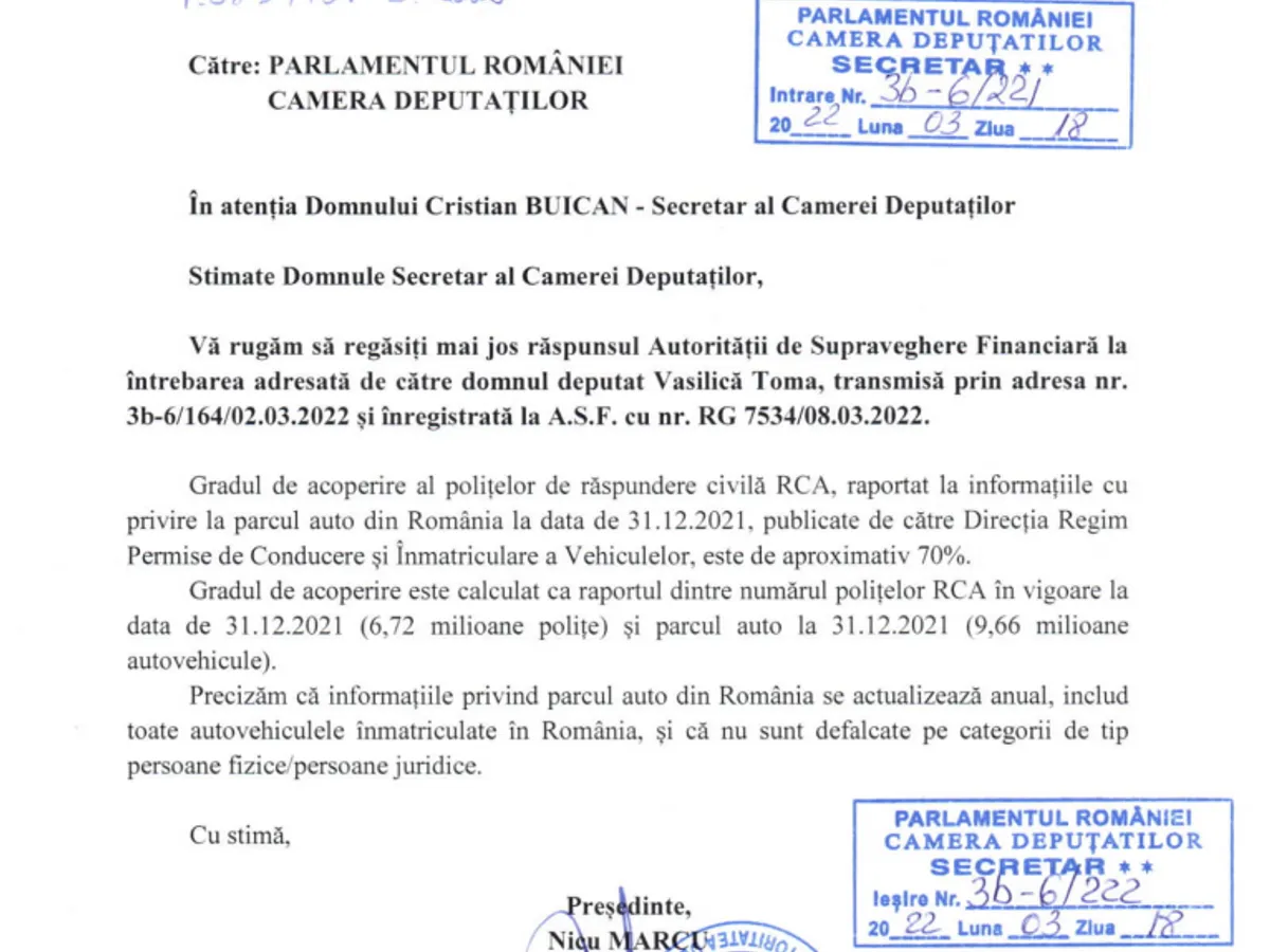 Datele sunt cuprinse într-un răspuns pe care Nicu Marcu, președintele Autorității de Supraveghere Financiară (ASF), l-a dat unei întrebări adresate în plenul Parlamentului de deputatul PSD Vasilică Toma.