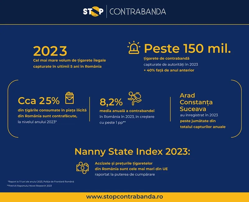 În 2023 se înregistrează cel mai ridicat volum al capturilor de țigarete ilicite în România în ultimii 5 ani, potrivit datelor centralizate pe StopContrabanda.ro. Spre comparație, în 2018 autoritățile române au capturat în total 112 milioane de țigarete.