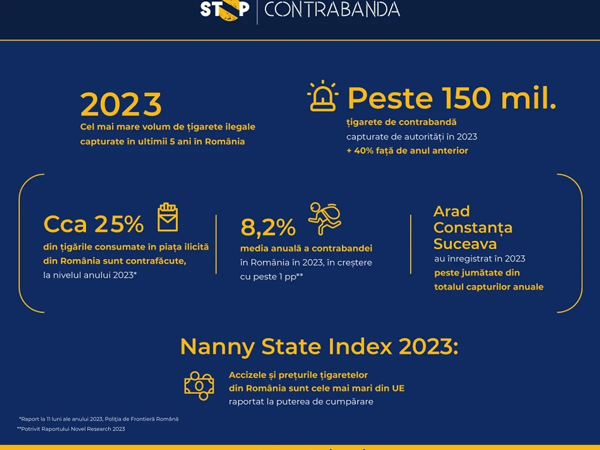 În 2023, media anuală a contrabandei cu țigarete în România se situează în media europeană din 2022, evaluată la 8,2% conform studiului KPMG. Anul trecut au avut loc 2 revizuiri succesive ale accizei la produsele din tutun și nicotină, în contextul în care accizele și prețurile țigaretelor din România sunt cele mai mari din UE raportate la puterea de cumpărare.