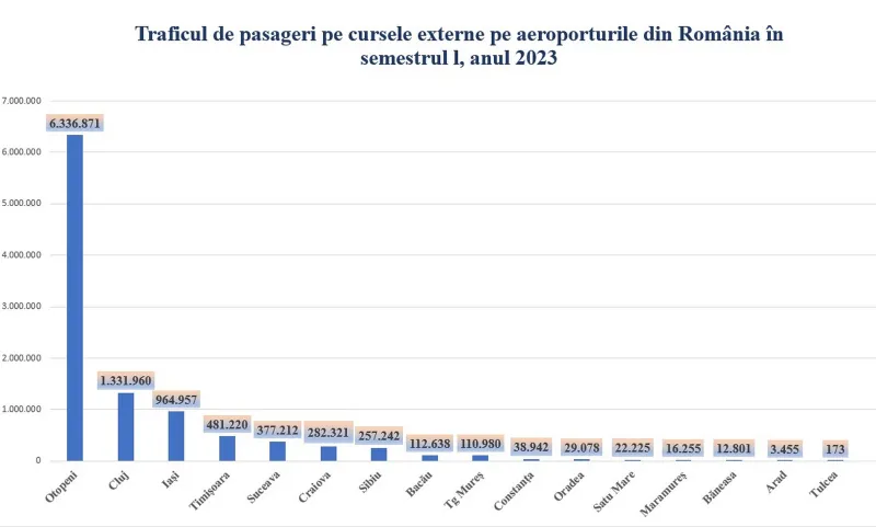 Traficul de pasageri pe cursele externe pe aeroporturile din România în primele 6 luni din 2023