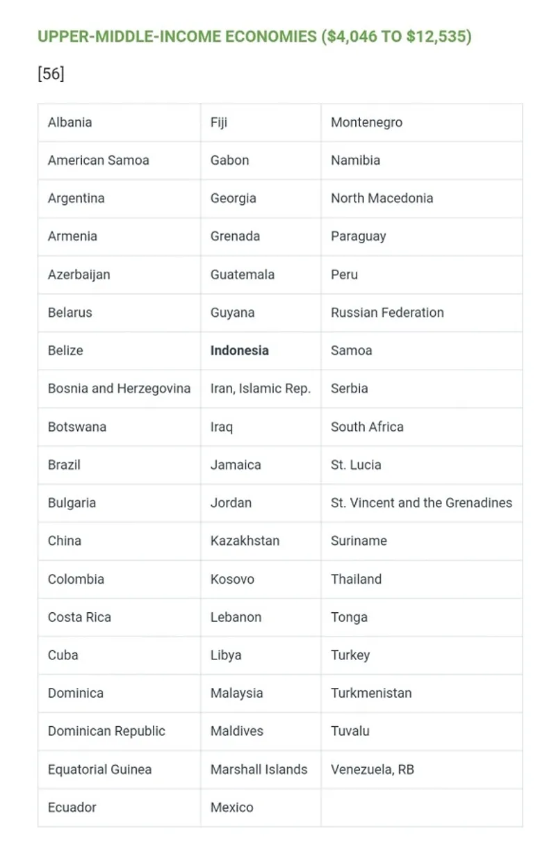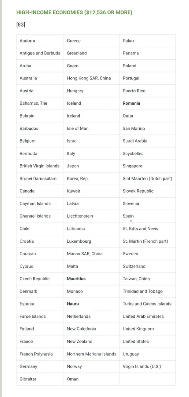 România a fost promovată în rândul ţărilor cu venituri mari , de peste 12.535 dolari brut pe an, pe cap de locuitor, ca urmare a rezultatelor economice din 2019. Este pentru prima dată când țara noastră a fost inclusă în această categorie.