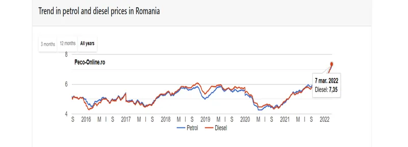 Prețul motorinei a ajuns la 7,35 lei pe litru fiind vorba de un maxim istoric din 2015 și până în ziua de azi.