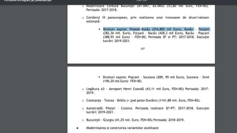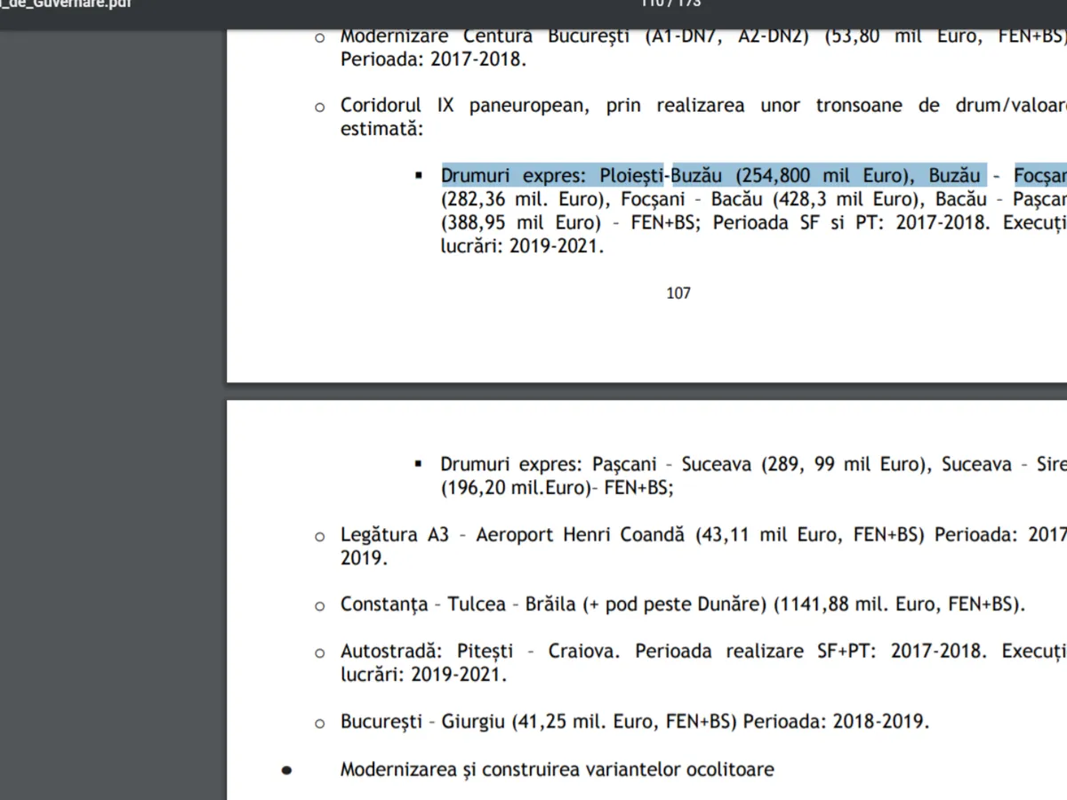 Drumuri expres: Ploieşti-Buzău (254,800 mil Euro), Buzău – Focşani (282,36 mil. Euro), Focşani – Bacău (428,3 mil Euro), Bacău – Paşcani (388,95 mil Euro)”.