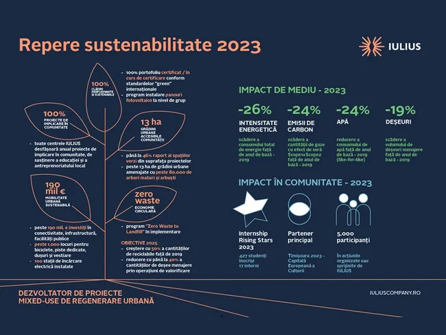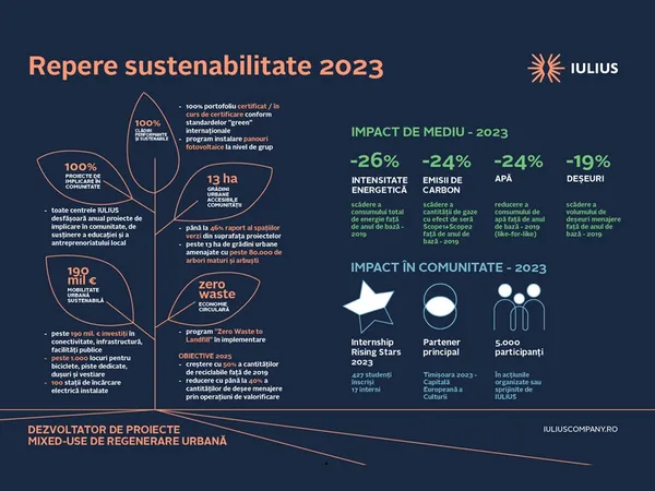„IULIUS a creat, prin proiectele sale de regenerare urbană, hub-uri pentru comunitate și poli de dezvoltare economică regională. Abordarea noastră este să refacem, prin investiţiile noastre, legătura comunităților cu orașele. Creăm spații care să răspundă nevoilor actuale ale comunității, dar le proiectăm astfel încât să faciliteze tranziția către un viitor mai sustenabil. În acest sens, anul trecut am finalizat strategia de reducere a emisiilor de carbon în colaborare cu International Finance Corporation și am continuat să investim în comunitățile în care suntem prezenți”, a spus Dan-Adrian Chelaru, Group Sustainability Officer IULIUS.