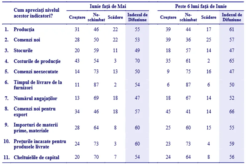 Nici managerii nu au speranțe prea mari, indexul de optimism al acestora a scăzut de la 63 de puncte în luna mai la 59 de puncte în iunie. „Valoarea indexului rezultă din agregarea aşteptărilor distincte ale managerilor privind cererea, producţia şi încasările viitoare. Scăderea aşteptărilor înseamnă că managerii nu au semnale de redresare. Doar exportatorii fac excepţie. Indicatorul de încredere privind comenzile pentru export a crescut de la 63 în mai la 66 în iunie”.