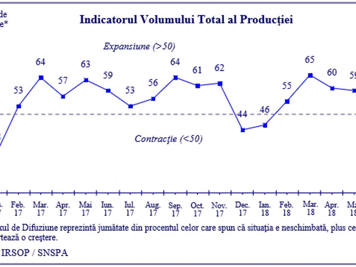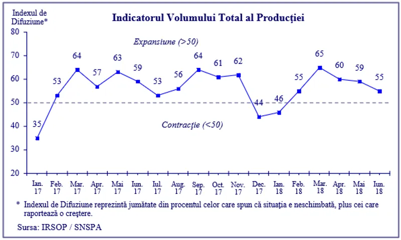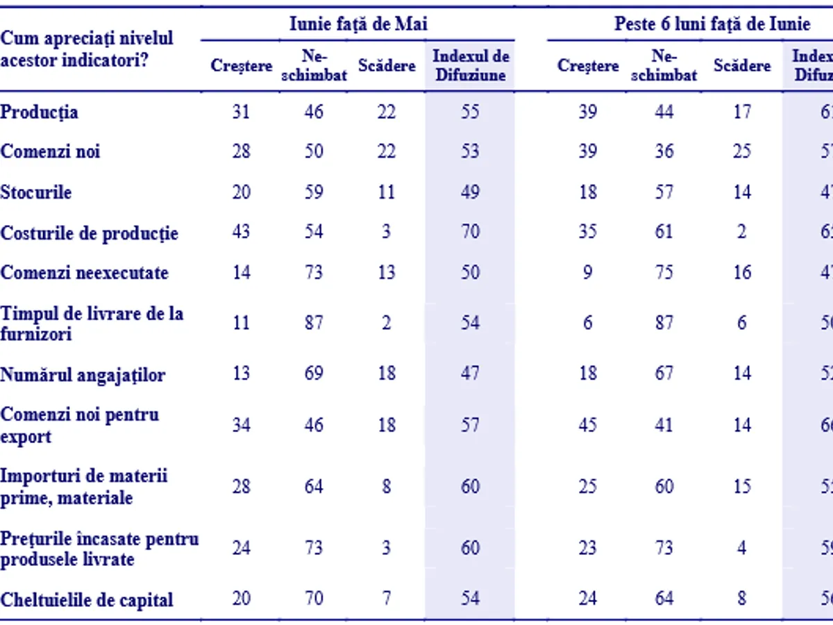 Deși volumul de creşterea a producției rămâne pozitiv (peste 50 de puncte), riscă să cadă sub 50 de puncte, în zona de contracţie iar stocurile rămân, mai degrabă, subdimensionate, datorită activităţii scăzute. Totuşi, observăm o uşoară urcare a stocurilor de la 47 de puncte în mai la 49 în iunie.