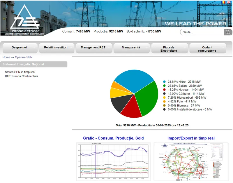 Ca idee, pe 5 aprilie 2023, la ora 12.00, conform datelor Transelectrica, consumul total național de energie electrică se ridică la 7.486 MW.