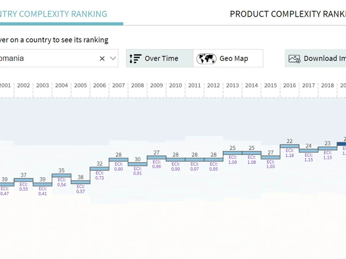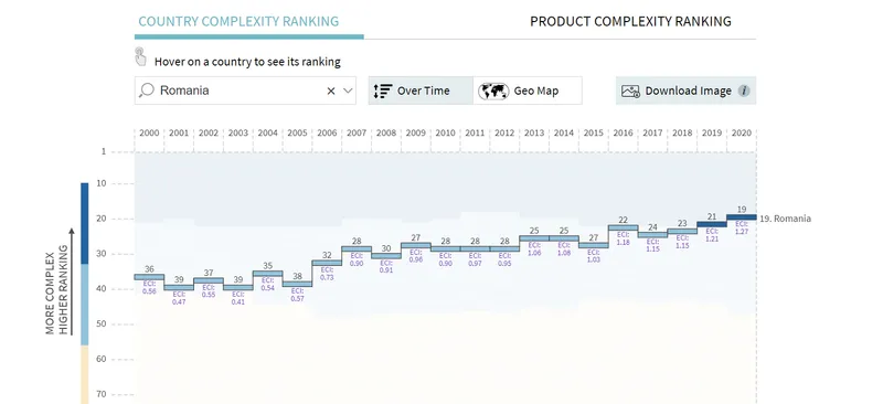 De la începutul anilor 2000, România a crescut constant în „Atlasul Complexității Economice”. De pe poziția 39, țara noastră a primit un imbold semnificativ odată cu aderarea la Uniunea Europeană, în 2007. După 10 ani de la aderare, în 2017, România ajunsese deja pe locul 24 și a crescut an de an, până pe locurile 23, 21 şi 19 în prezent.