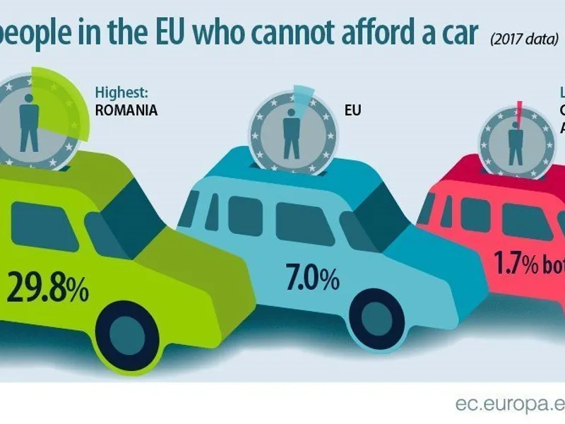 În medie, în Uniunea Europeană doar 7% din populație nu își permite să cumpere un automobil. Conform Eurostat, în România, însă, procentul este de peste patru ori mai mare, șoferii români conducând detașat top-ul sărăciei în 2017.