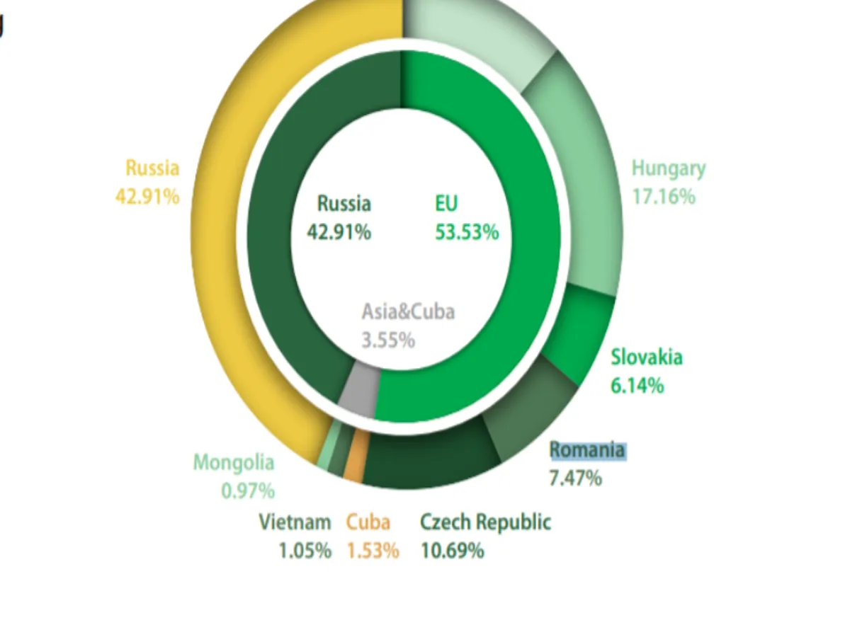 În 2018, Rusia avea 42% din capitalul vărsat al băncii, iar România avea 7,4%. (vezi mai jos).