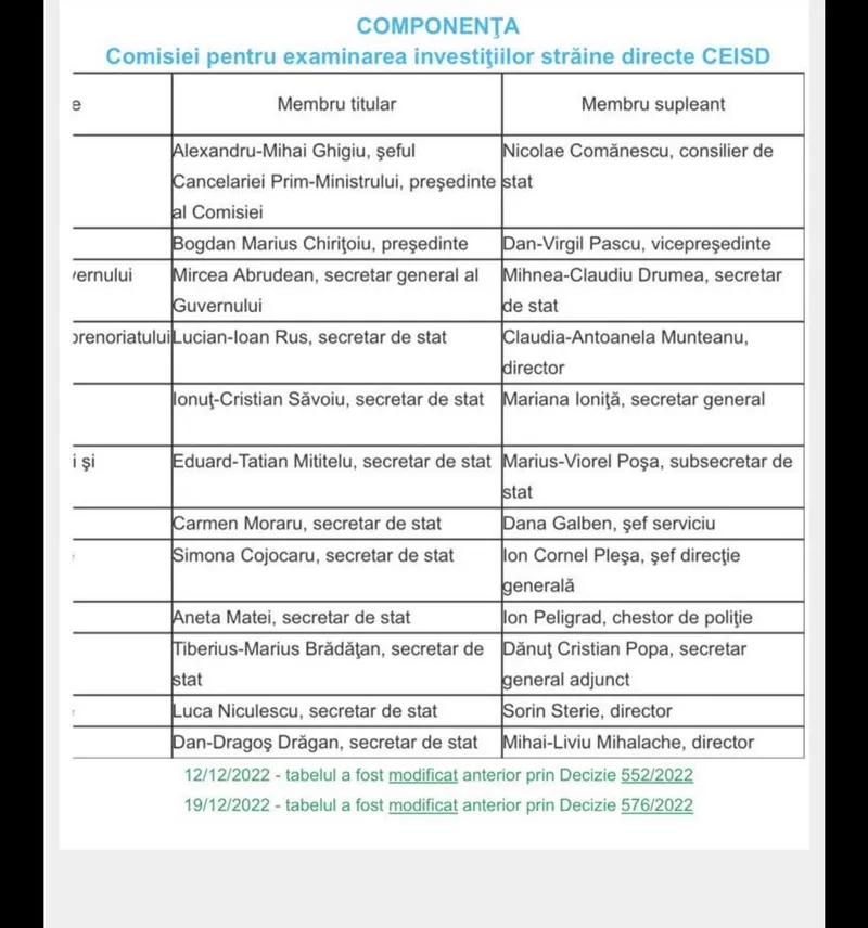 “Componența Comisiei pentru Examinarea Investițiilor Străine Directe (CEISD) este clasificată, potrivit deciziei prim-ministrului nr. 339 din 2 iulie 2025 (…)