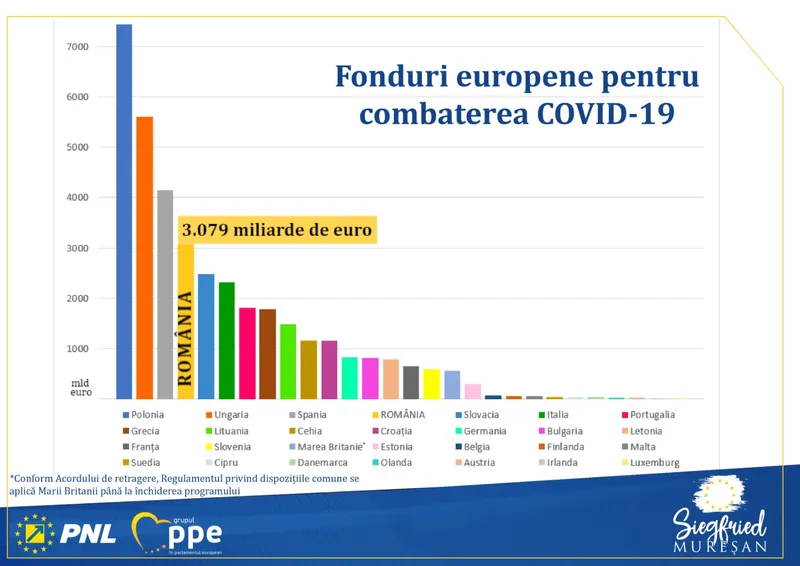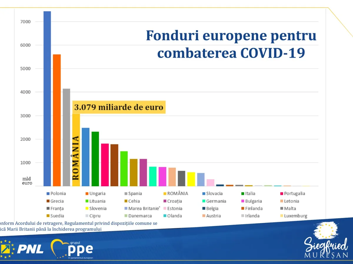 Siegfried Muresan, europarlamentar PNL şi vicepreședinte al PPE, a anunțat că României îi revin 3,1 miliarde de euro din ajutorul pe care Uniunea Europeană îl acordă statelor membre.