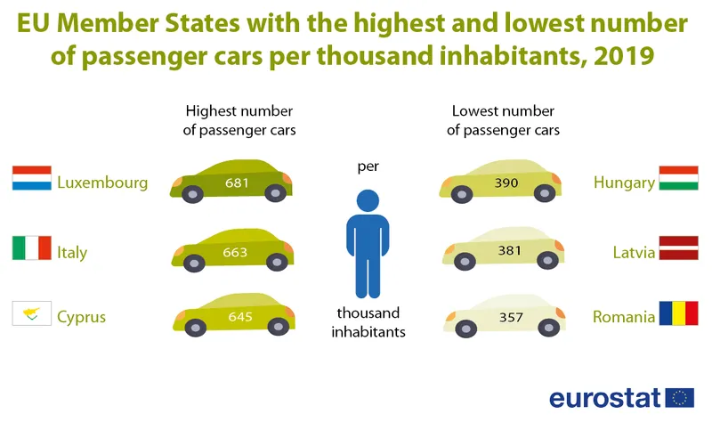 De cel puțin 30 de ani, Luxemburg înregistrează cea mai mare rată de motorizare între statele membre ale UE. În 2019, în acea țară existau 681 de autoturisme la mia de locuitori. Această cifră poate fi influențată de lucrătorii transfrontalieri care folosesc mașini de companie înmatriculate în această țară, explică Eurostat.