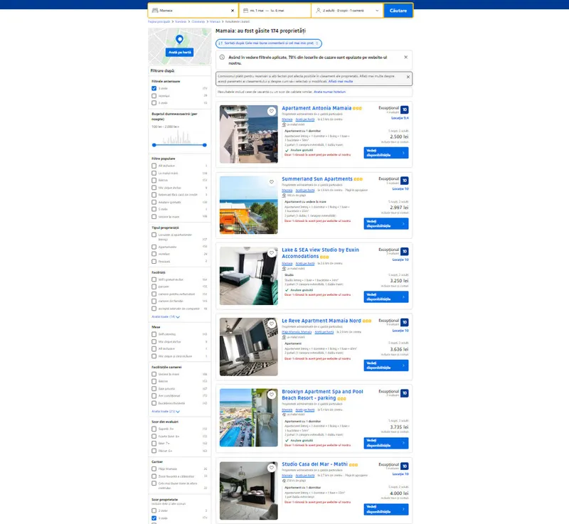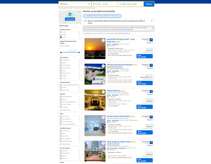 Pentru turiștii care caută mai mult confort, 5 nopți de cazare la 4* în Mamaia, într-o unitate cotată bine pe portal, costă cel puțin 650 €. Dar, la fel, există o singură ofertă la acest preț. Următoarele sunt la 890 - 1.000 €.