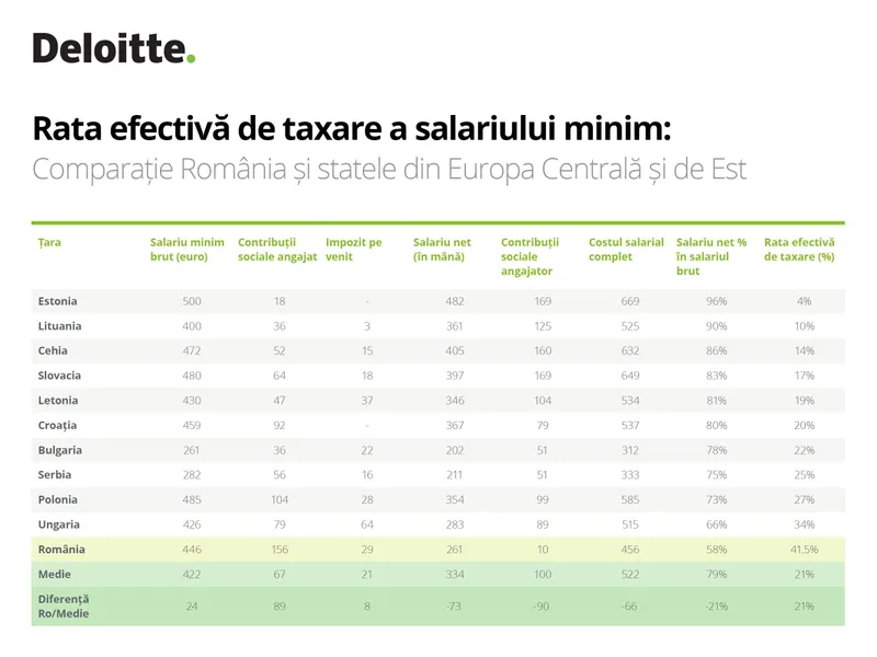 Salariul minim brut din Romania depășește media regiunii Europei Centrale și de Est. În același timp, are cea mai ridicată rată efectivă de taxare dintre statele din regiune, de 41,5%, potrivit unei analize Deloitte România.