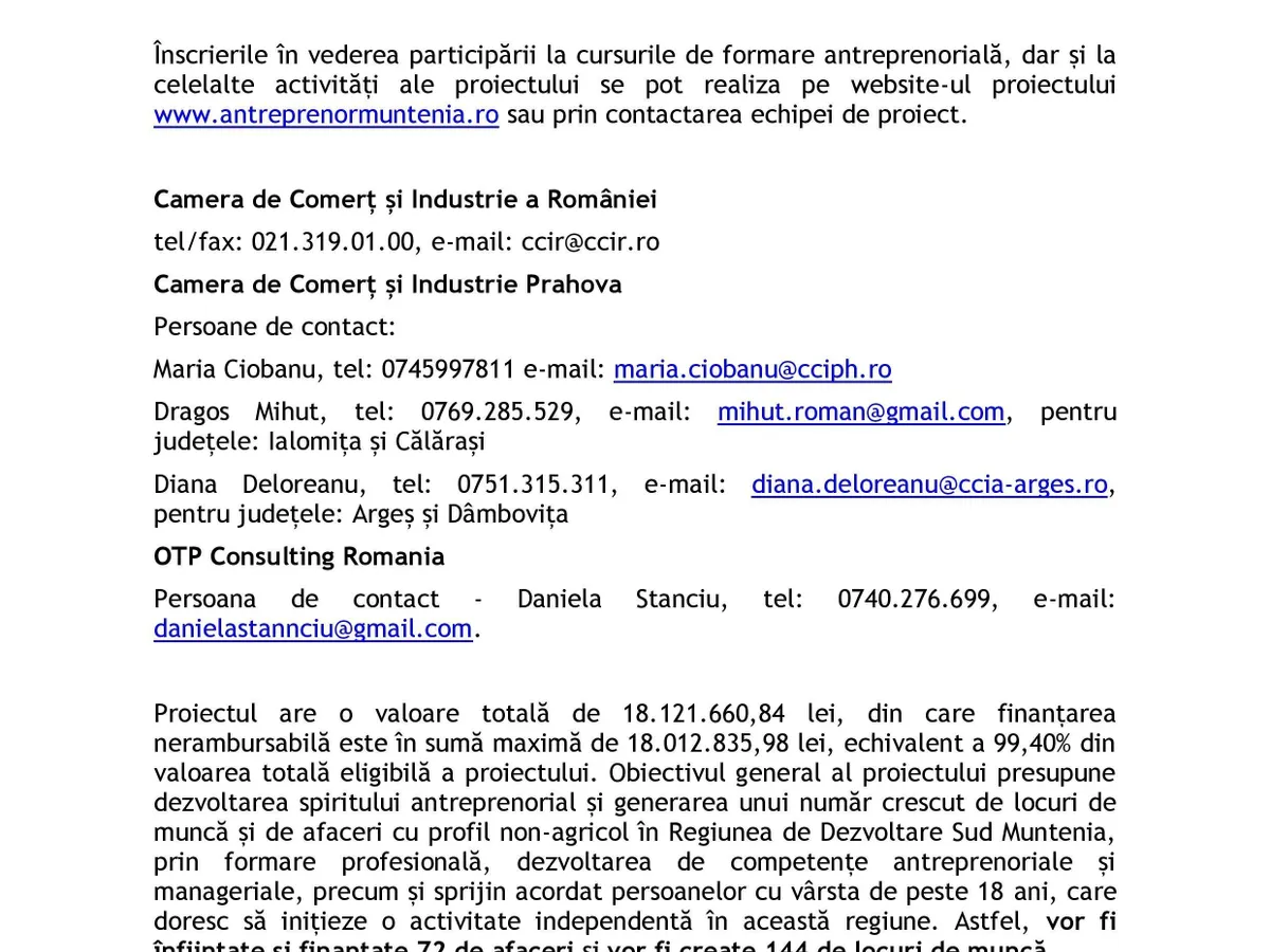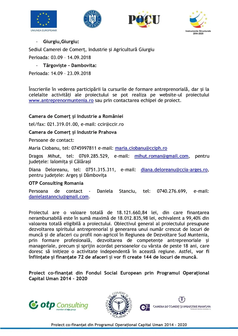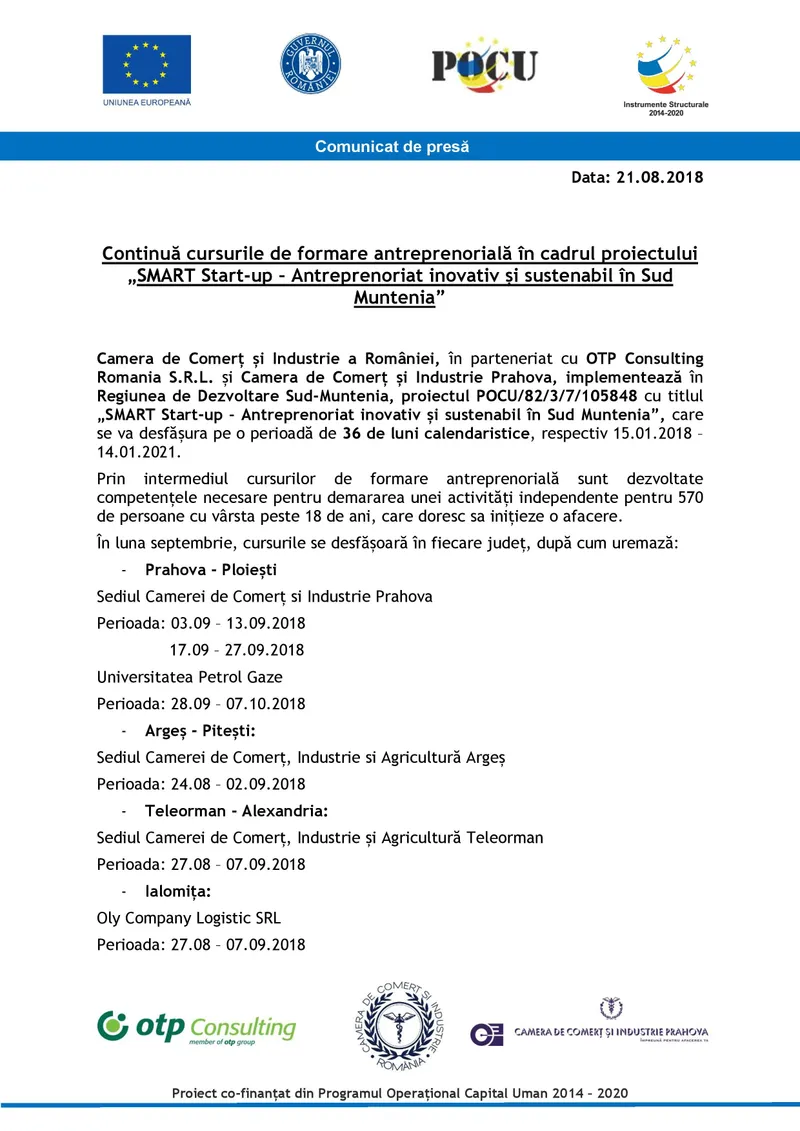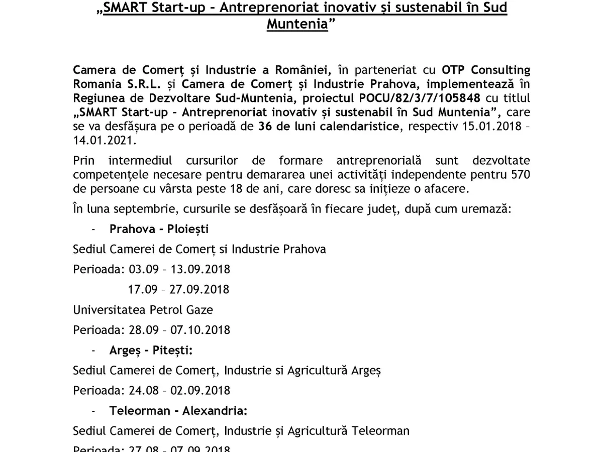 Cursurile de formare antreprenorială din cadrul proiectului „SMART Start-up – Antreprenoriat inovativ și sustenabil în Sud Muntenia, urmează să continue, potrivit unui comunicat de presă emis de Camera de Comerț și Industrie e României.
