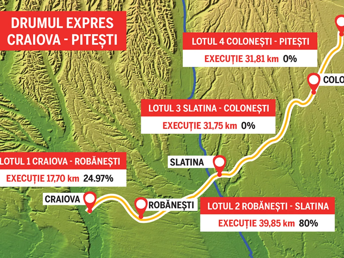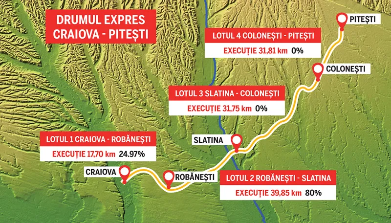Pe o porțiune de 63 de kilometri (Slatina - Pitești) lucrările nu au început în acest moment. Lucrările au început abia în anul 2020.