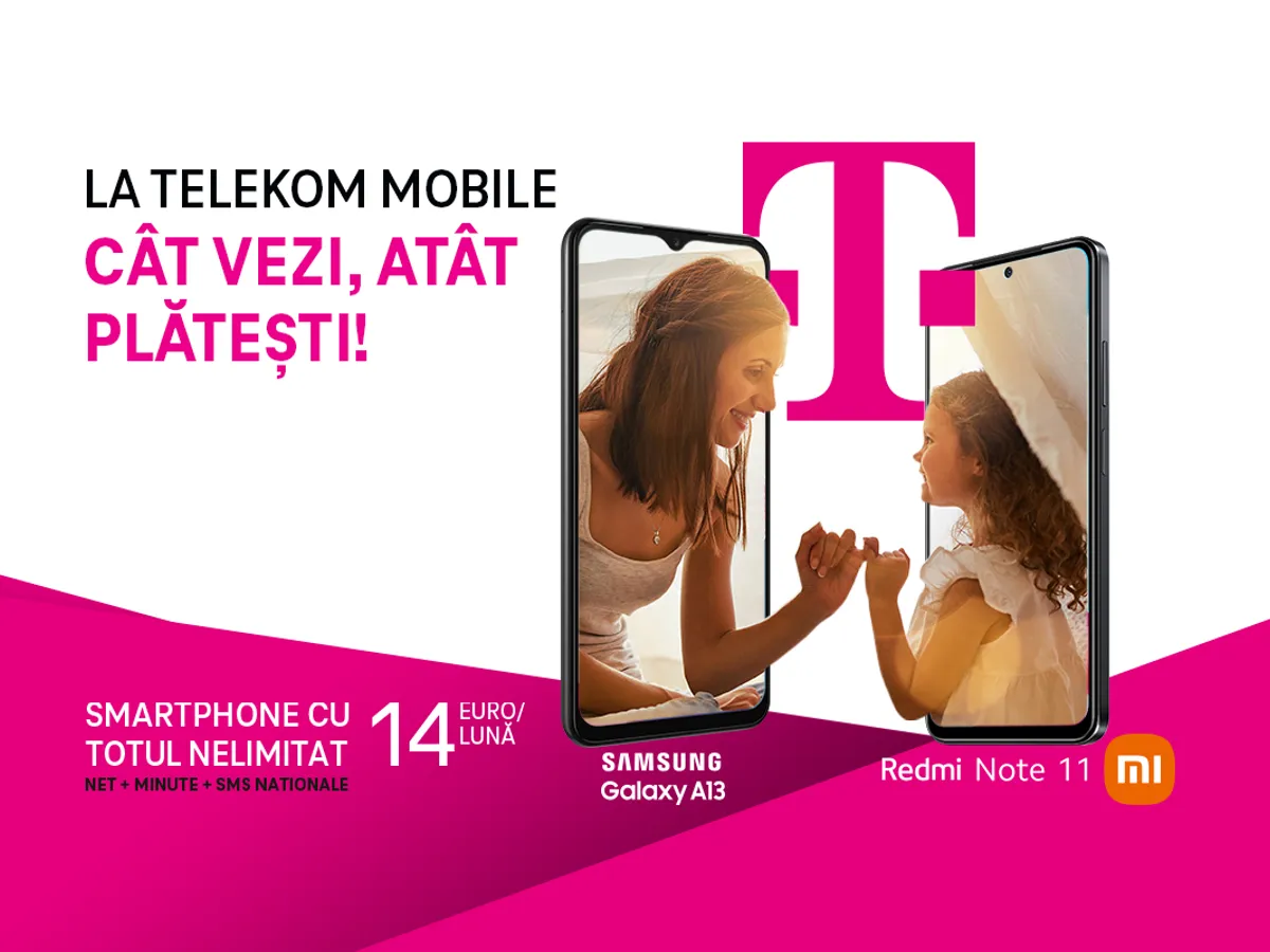 Pentru a simplifica și mai mult experiența clienților, Telekom Mobile a creat pachete speciale cu noile abonamente și telefoane incluse, oferind acces la telefon cu beneficii naționale nelimitate, cu un cost lunar transparent, fără surprize la factură, în spiritul „cât vezi, atât plătești”. Astfel, la portarea de la abonament sau la reînnoirea contractului, tariful de 14 euro/lună include un smartphone la alegere între Samsung Galaxy A13 sau Xiaomi Redmi Note 11.