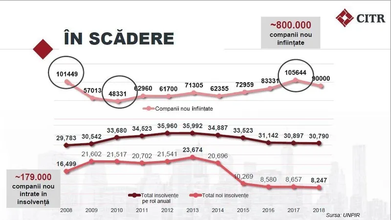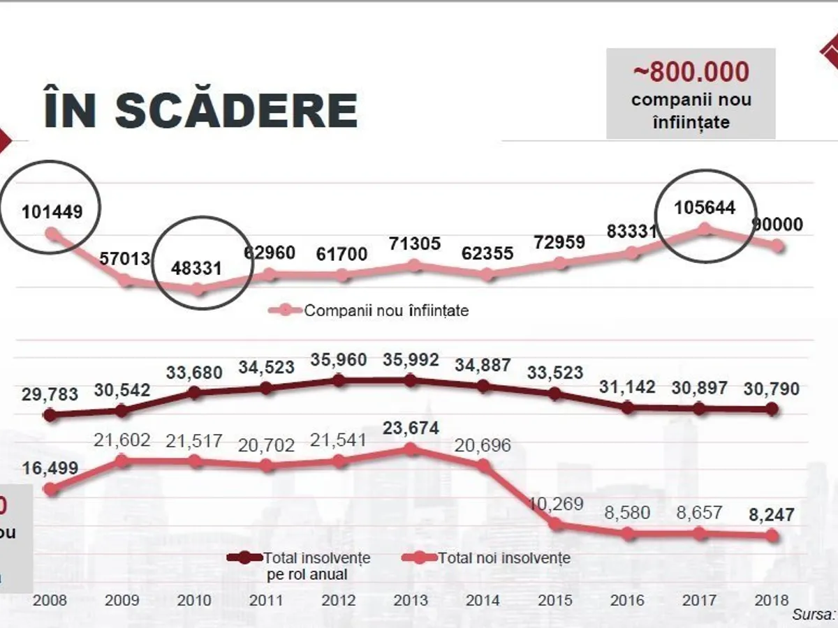România înregistra 16.499 de insolvențe noi în 2008, în timp ce estimarea pentru finalul acestui an este de aproximativ 8.300, respectiv jumătate din numărul înregistrat în urmă cu zece ani. Totodată, în perioada 2016-2018, numărul de companii intrate anual în insolvență a devenit constant, între 8.300-8.600. În același interval, numărul companiilor de impact (cu active care depășesc 1 milion de euro) care intră în insolvență s-a stabilizat între 175-200.
