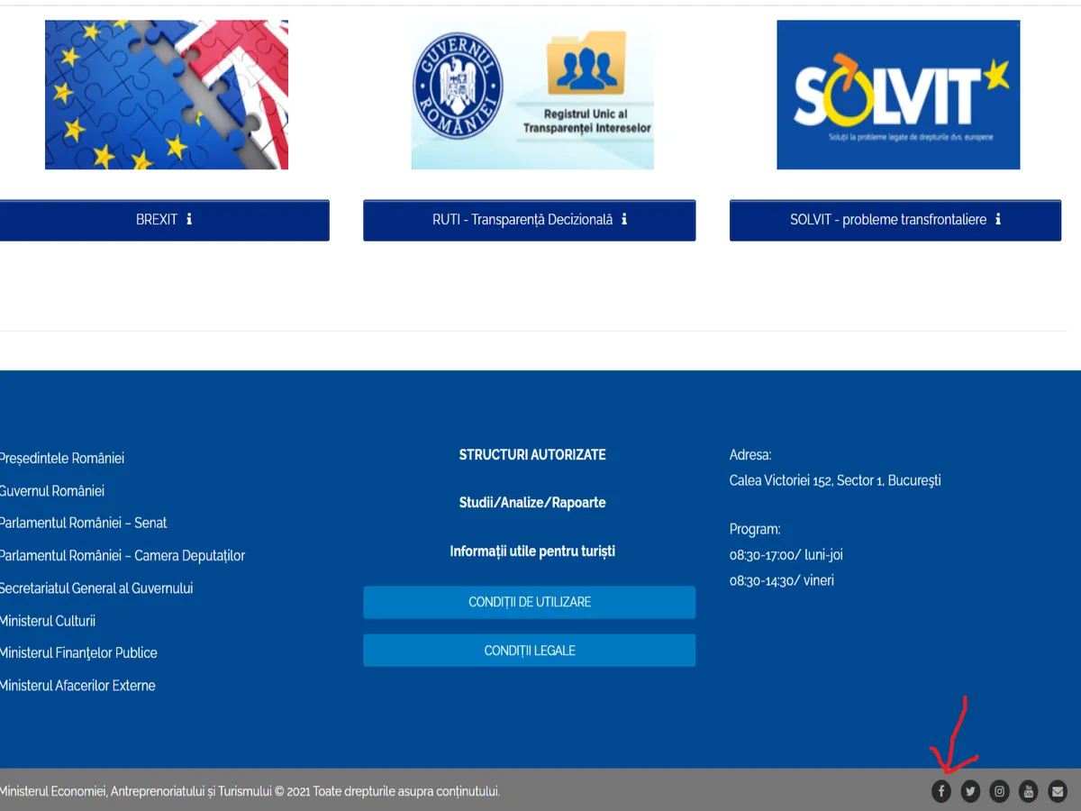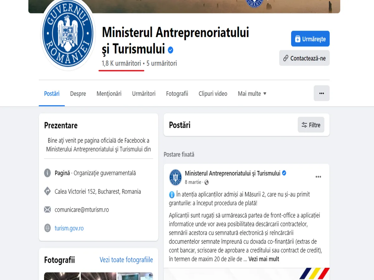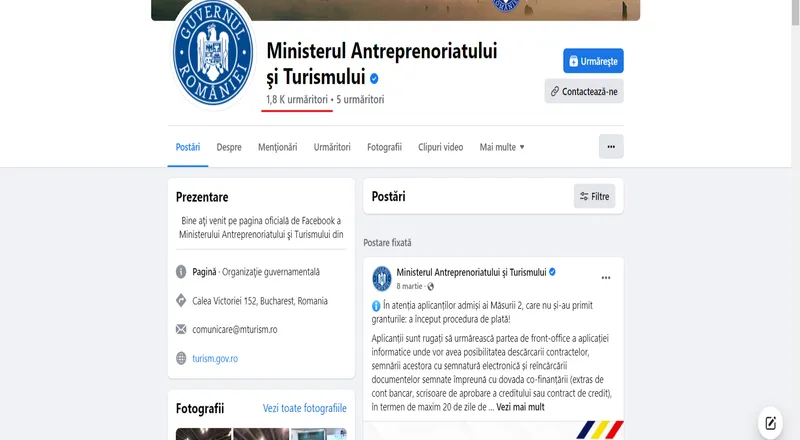 Doar căutând pe FB găsești și (noua) pagină de Facebook a Ministerului antreprenoriatului și turismului care este urmărită de un număr infim de persoane: 1.800. Singurul link de pe această pagină de Fb este către pagina de Internet a ministerului (foto jos) aspect important de ținut minte.