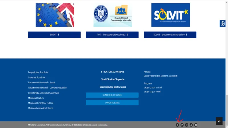 Așa cum e și normal, ministerul are conturi pe rețelele de socializare. În josul site-ului de prezentare a Ministerului se află un buton de Facebook. El este foarte mic și greu de găsit (foto jos).
