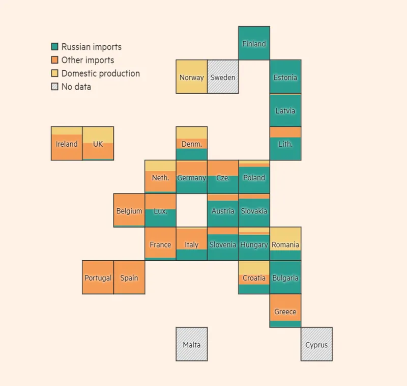 Țările vest-europene tind să se bazeze pe importurile din alte surse. Norvegia este un furnizor cheie de gaz prin conducte, iar Qatar și SUA furnizează blocului gaz natural lichefiat (GNL), care este transportat cu o navă.
