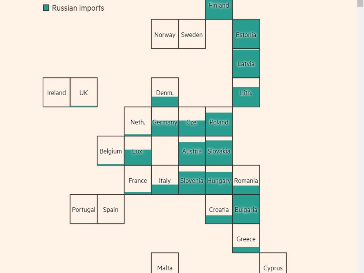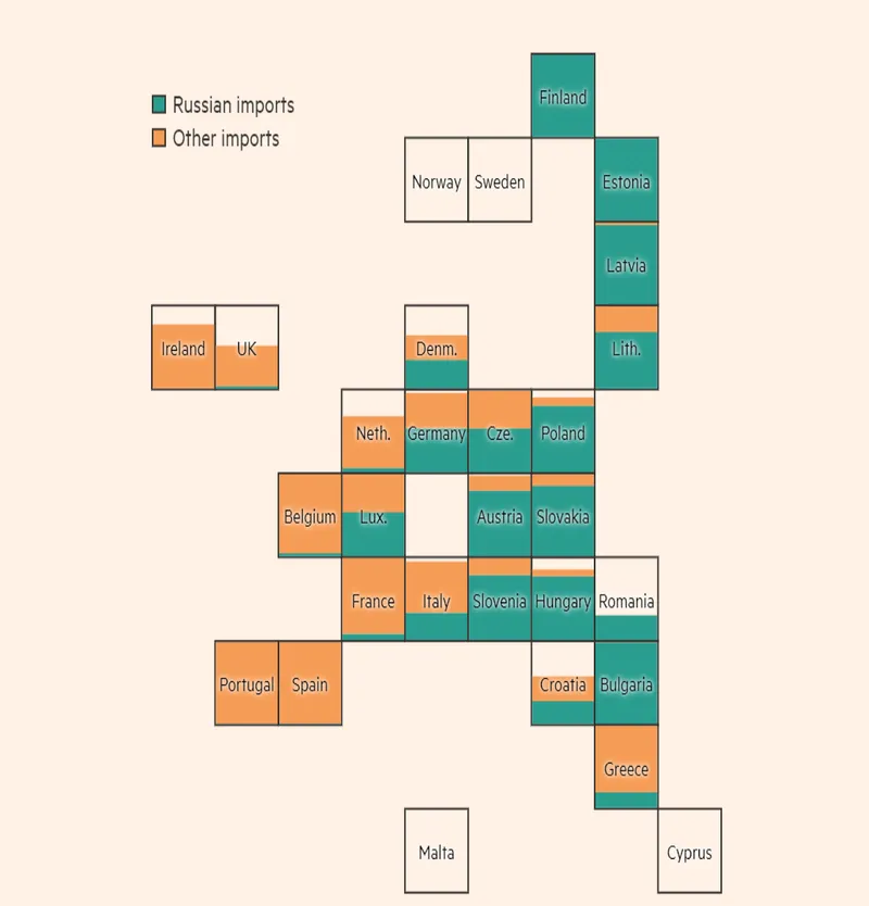 În 2021, 34% din aprovizionarea cu gaze a UE a fost importată din Rusia, în mare parte prin conducte. Țările din estul, nord-estul și centrul Europei sunt dependente în special de aprovizionarea din Rusia.