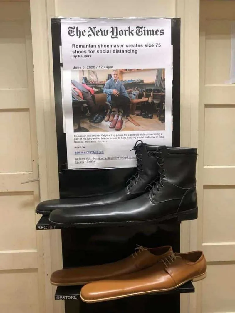 „Vedeai la televizor că lumea nu respectă regulile de distanțare socială, cozi la magazine erau mereu. Odată am văzut niște pantofi mai lungi și m-am gândit să fac o pereche și mai mare, care să fie pentru distanțare socială. De acolo a pornit ideea”, relatează el, amuzat de inovația care a prins atât de bine la public.