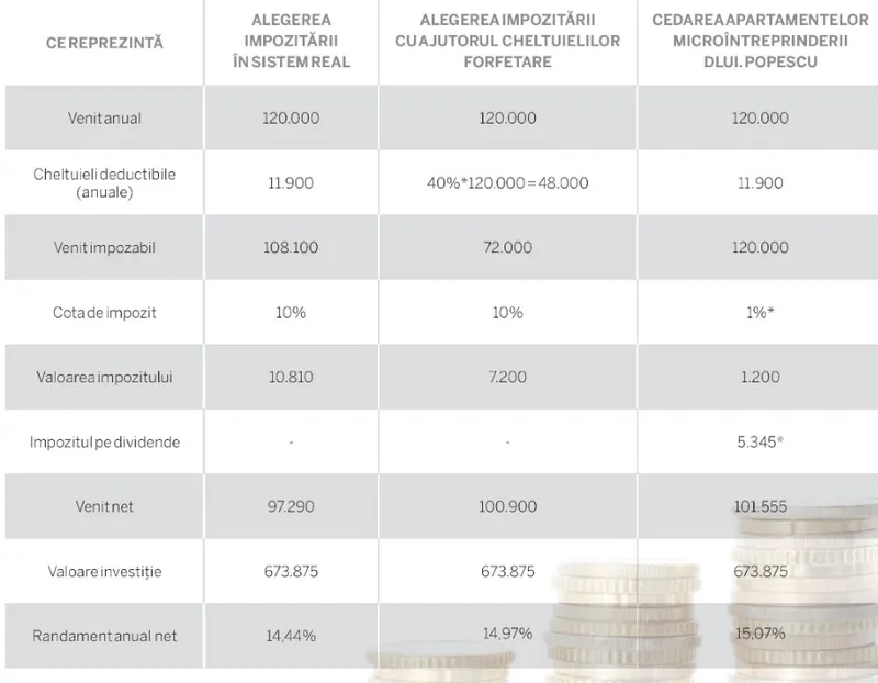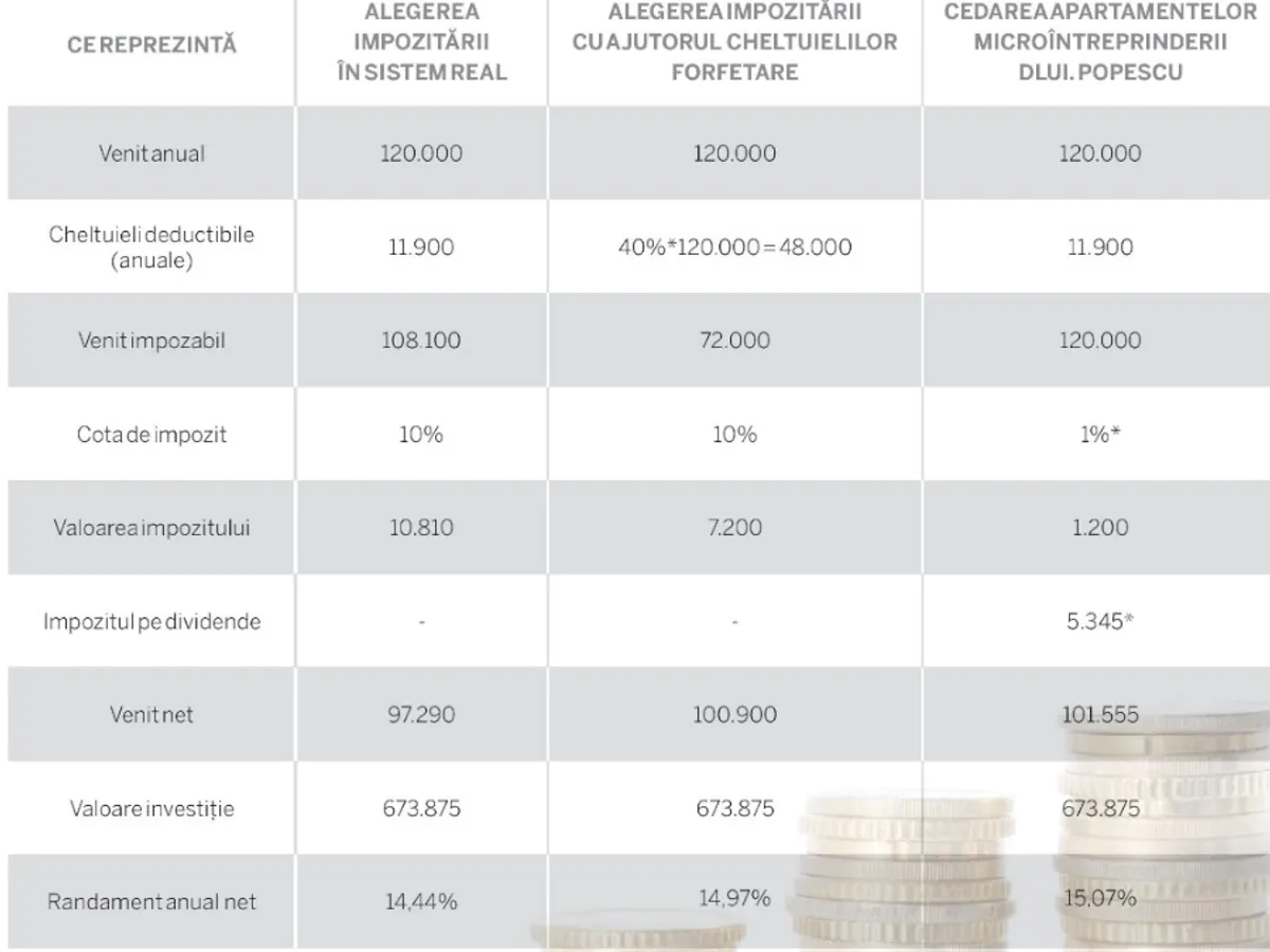Prin urmare, familia Popescu a investit aproximativ 25.000 Euro (inclusiv TVA) pentru fiecare din cele două apartamente. În prezent, fiecare dintre cele două apartamente este închiriat cu 5.000 Lei/lună, ceea ce înseamnă că venitul anual din chirii al familiei Popescu este de 120.000 Lei.