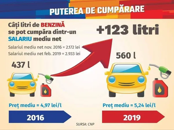 Multe din slide-urile PSD-urile, care rulează în mediul online, pentru a-i convinge pe oameni să voteze cu partidul lui Dragnea sunt mincinoase. În unul din ele, PSD încearcă să dovedească faptul că „românii au o mai mare putere de cumpărare”. PSD scrie că, la un salariu mediu de 2.933 de lei, se pot cumpăra 123 de litri de benzină, la un preț de 5,24 de lei pe litru. Doar că, potrivit peco-online.ro, prețul mediu la benzină este mult mai mare, de 5,8 lei. În aceste clipuri de promovare ale PSD, prețul benzinei este cu 56 de bani mai mic. PSD a ieftinit cu 12% prețul benzinei în clipurile de campanie. Benzina a fost la prețul invocat de PSD – 5,24 de lei pe litru, în urmă cu aproape un an și jumătate, pe 15 decembrie 2017.