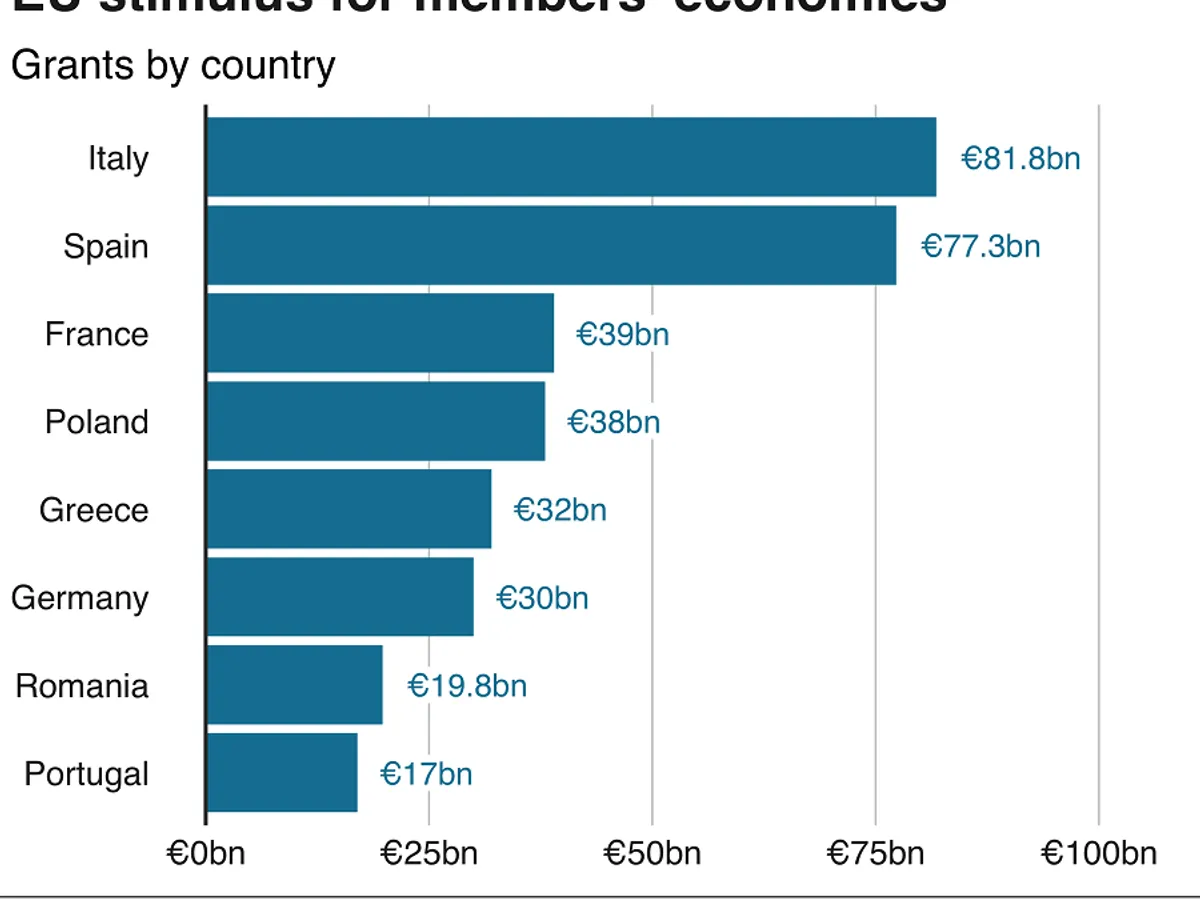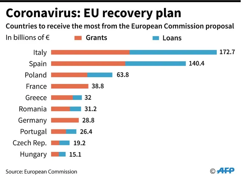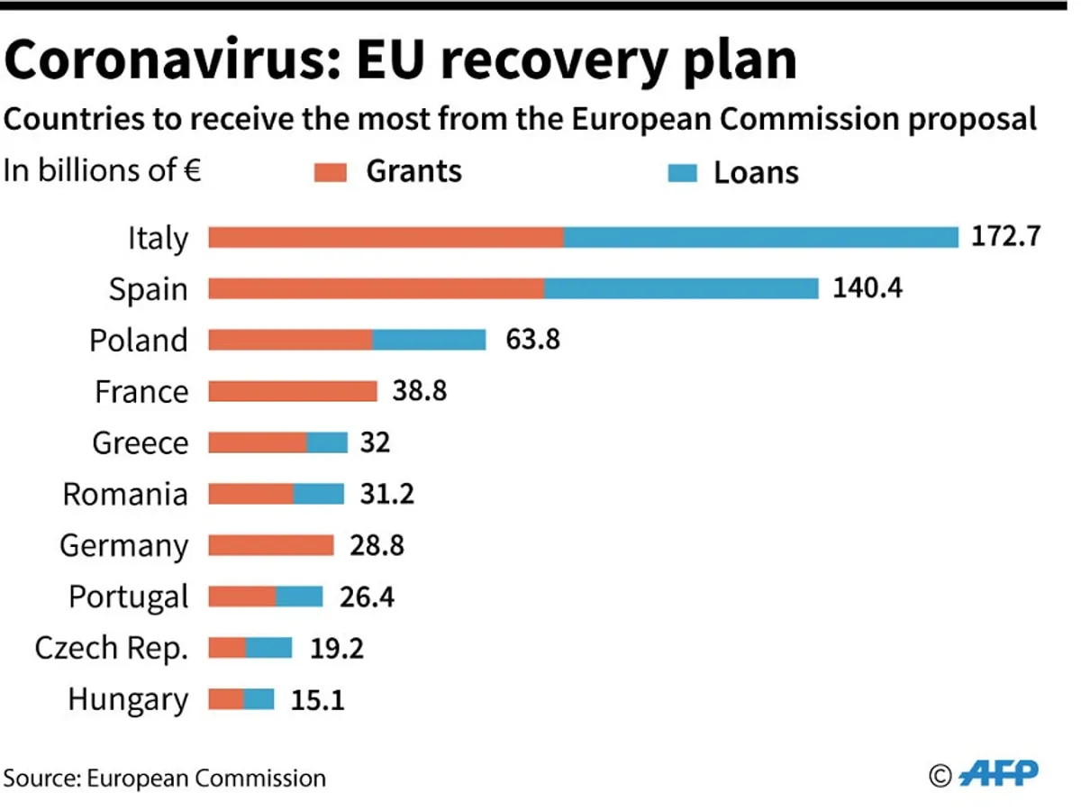 În plus, a fost aprobat Fondul UE de relansare economică post-pandemie, în valoare de 750 de miliarde de euro, format din subvenţii nerambursabile de 390 de miliarde de euro şi din credite de 360 de miliarde de euro