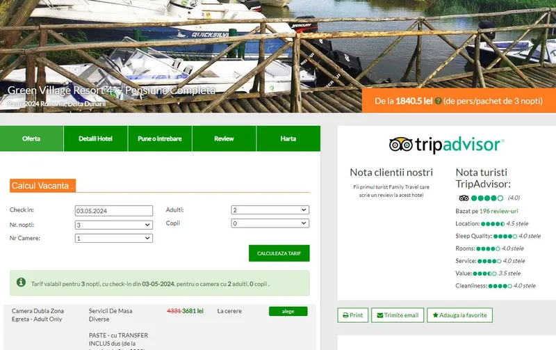 O vacanță de 3 nopți (3-6 aprilie) de Paște 2024 în Delta Dunării, la Green Village Resort 4*, cu pensiune completă, pentru 2 persoane, pornește, la ofertă, de la 3.681 lei (736 euro). Rezultă, minimum 245 euro/noapte/2 persoane.