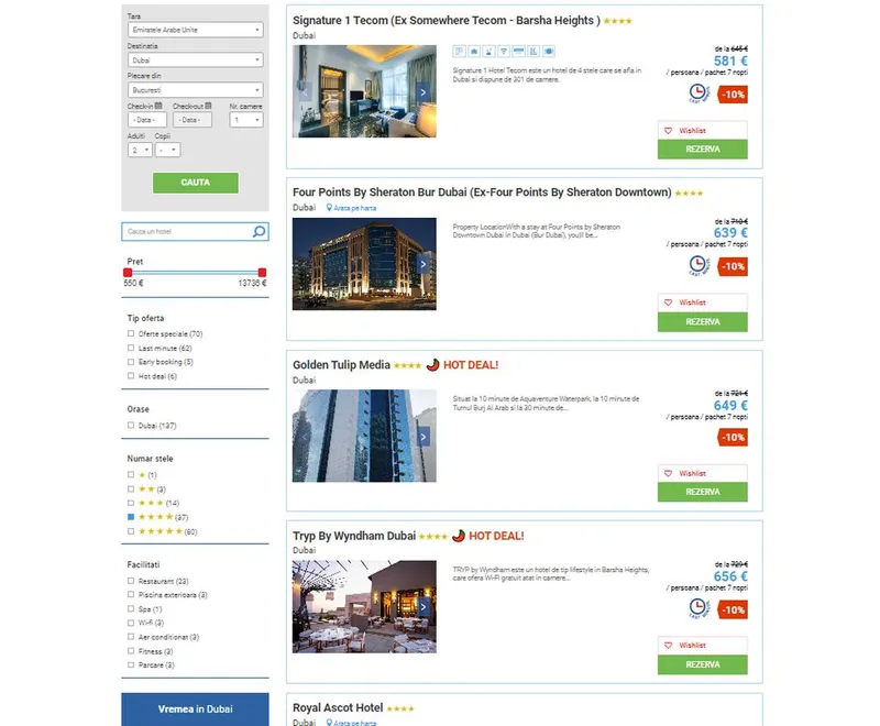 Pachetul include transport cu avionul București – Dubai – București, 1 bagaj de cală de 20 kg, 1 bagaj de cabină de 7 kg, cazare cu mic dejun, transferuri aeroport – hotel – aeroport, taxele de aeroport și catering la bord.