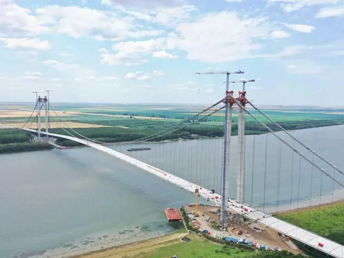 Lucrările la podul suspendat peste Dunăre de la Brăila au început în 2017 și trebuiau terminate în decembrie 2021.