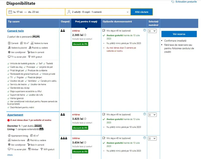 În perioada 17-23 iulie 2023, de exemplu, o cameră twin la hotelul de 3* al lui Cristi Borcea din Olimp costă 400 de lei pe noapte (aprox. 80 euro), iar prețul unui apartament este de 640 de lei pe noapte (aprox. 130 euro).