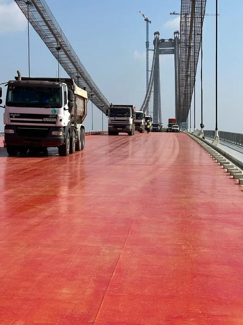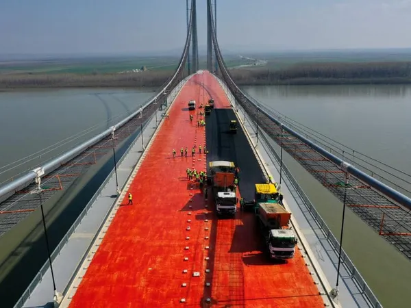 Podul peste Dunăre de la Brăila a mai avansat un pic după ce constructorul a turnat primul strat de asfalt.
