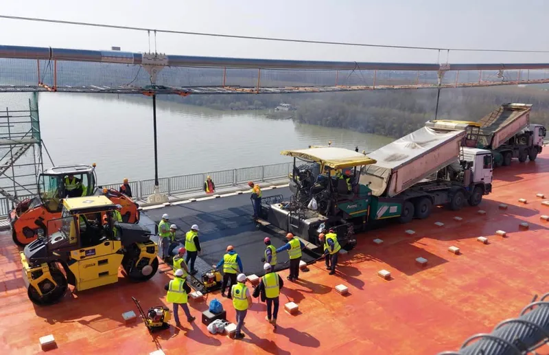 Astăzi a început așternerea primului strat de asfalt pe podul suspendat;