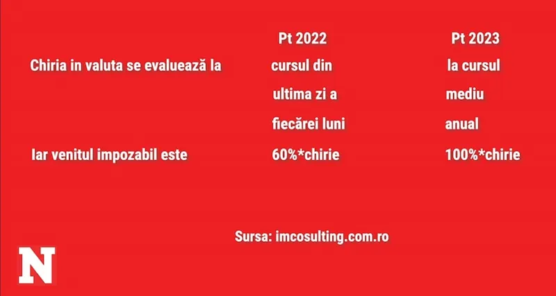 - Pentru 2023 - Chiria în valută se evaluează se calculeză la cursul mediu anual