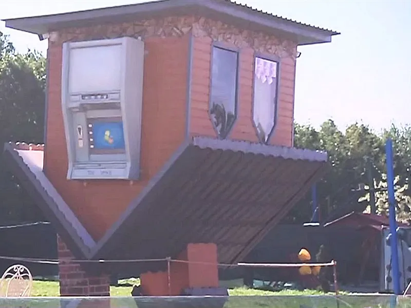 Și în interior, toate obiectele de decor sunt montate invers. Turistă: „Chiar este o idee foarte bună și felicitări pentru el!” Taxa de intrare este de 15 lei pentru copii și 20 de lei pentru adulți,