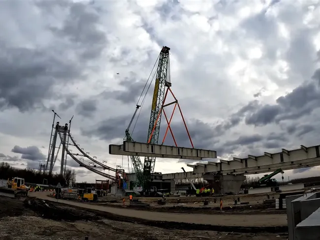 Italienii (WeBuild) au montat primii 90 de metri de tablier metalic. În filmarea noastră vedeți macaraua verde de mare capacitate (600 tone) a celor de la Deme Macarale, supranumită de comunitatea noastră "Hulk", care instala o secțiune a tablierului metalic al viaductului de acces pe malul Brăila”, scrie Asociația Pro Infrastructură.