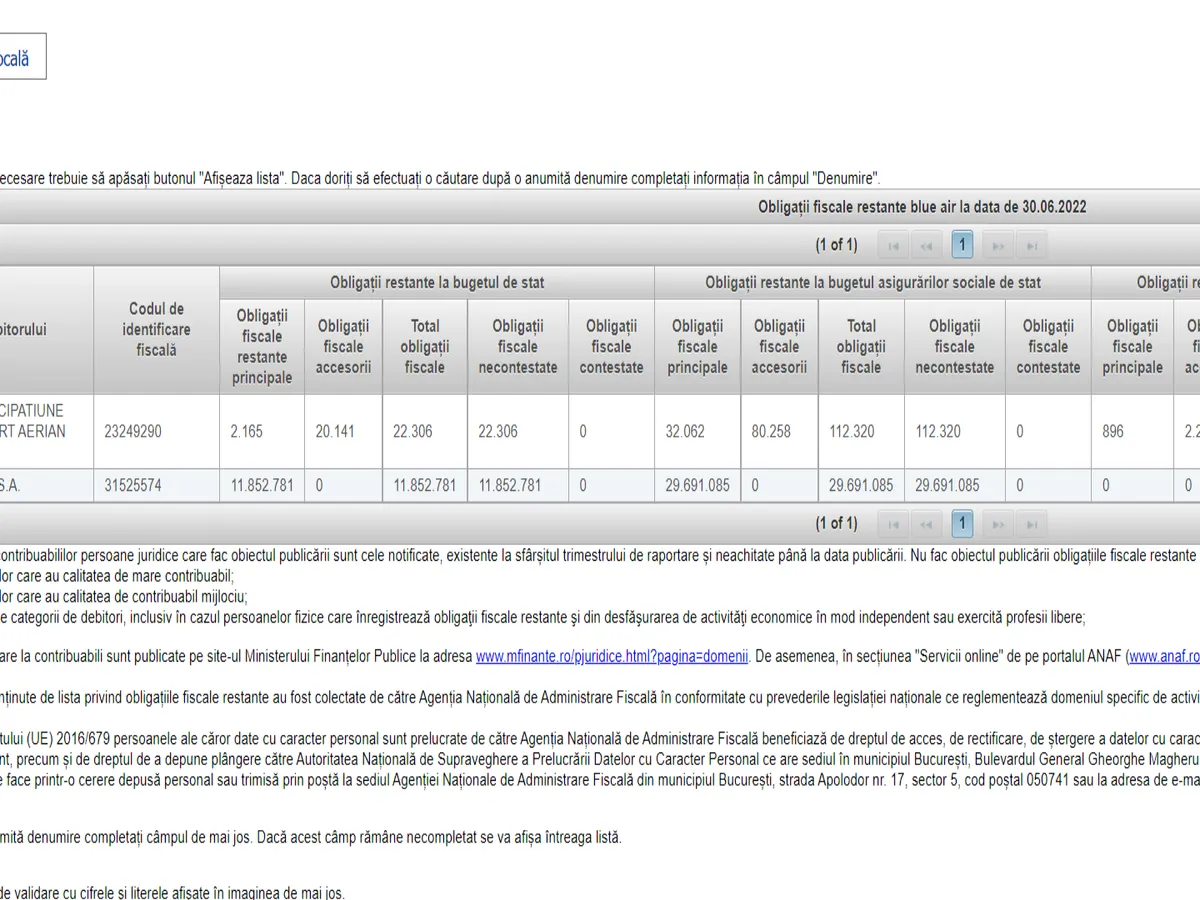 Potrivit datelor ofiaile, compania avea datorii la ANAF în valoare de 11,8 milioane de lei la bugetul de stat. ANAF mai meționează restanțe de 29 de milioane de lei la asigurările sociale. La „sănătate”, restanțele erau de aproape 10 milioane de lei.