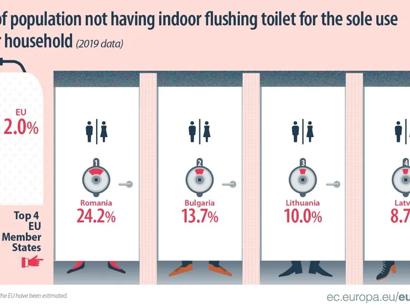 Anticipând Ziua Mondială a Toaletei, care este celebrată la 19 noiembrie, Eurostat publică o statitistică din care reiese că România este țara europeană cu cele mai multe WC-uri în fundul curții, la mare distanță de alte state din UE.