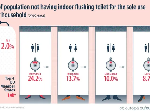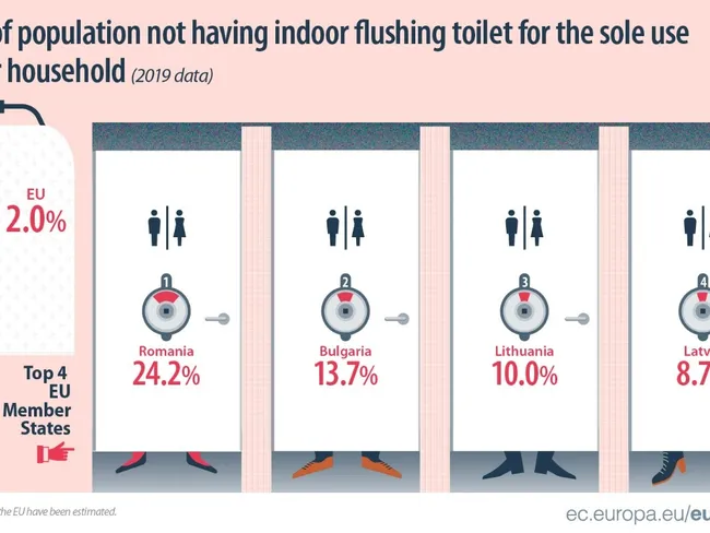 Potrivit Eurostat, în România, 24,2% din toalete nu sunt conectate la rețeaua de canalizare. Bulgaria este pe penultimul loc al clasamentului, 13,2% din toalete nefiind racordate la canalizare.