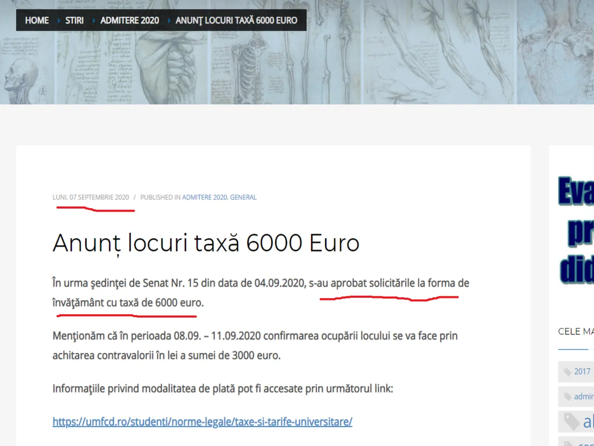 În urma ședinței de Senat Nr. 15 din data de 04.09.2020, s-au aprobat solicitările la forma de învățământ cu taxă de 6000 euro. Menționăm că în perioada 08.09. – 11.09.2020 confirmarea ocupării locului se va face prin achitarea contravalorii în lei a sumei de 3000 euro.”